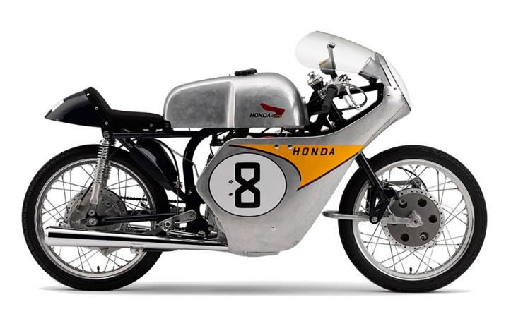 Dikelas 50cc, Honda punya mesin twin silinder yang super-duper mini tapi sangar secara tenaga. Soalnya, waktu itu motor balap GP50 mereka bisa menghasilkan output tenaga sekitar 12 HP. So, menurut Irimajiri waktu itu, kenapa nggak bikin yang versi silindernya 5 biji aja biar jadi 125cc…? Kan 50 dibagi 2 itu sama dengan 25cc per silinder, kalau dikali 5 jadi 125cc kan?