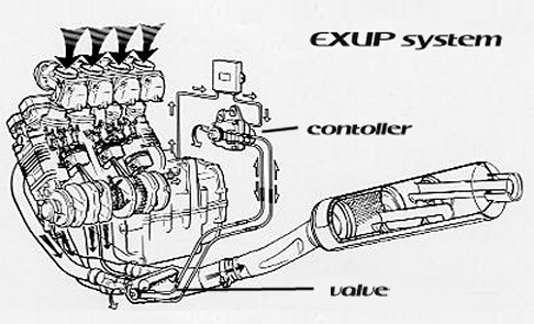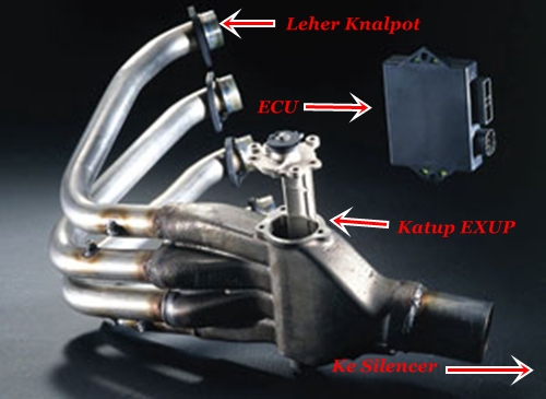Teknologi ini adalah Penempatan sejenis katup (Valve) pada Knalpot motor Yamaha. . . Prinsip kinerjanya mirip seperti Powervalve pada motor 2-Tak. . . Penggunaan teknologi EXUP System ini memiliki banyak fungsi yang cukup membuat akselerasi meningkat & power merata di setiap rentang RPM mesin. . . Hasilnya, Power ala mesin inline yang lemot di putaran bawah akan tereliminir dan mampu menghasilkan tarikan yang lebih mantap dibanding sistem knalpot standar. . . Bila Brosist ada yang melihat secara langsung spyshot-nya, Ciri yang sangat gamblang dari penggunaan teknologi ini yaitu suara knalpot yang sangat senyap dalam kondisi idle RPM (1000 – 2000 RPM) . . .