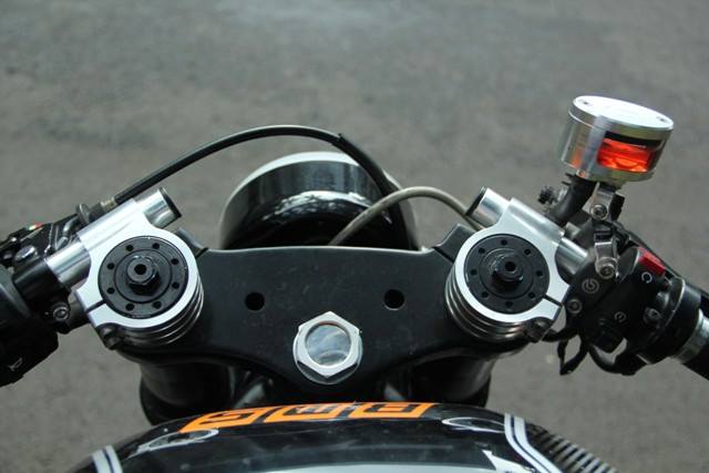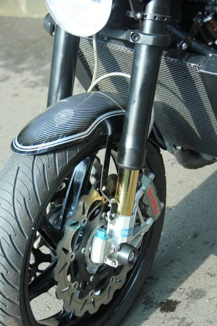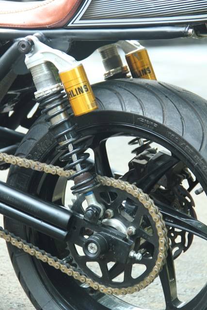 Frame/Sasis dirombak total Brosist !! Frame milik Fireblade yang terkenal dengan Rigiditasnya kini diubah menjadi model Pipa Tubular yang menguatkan kesan Cafe Racer-nya. . . Tak hanya itu, Suspensi belakang pun ikutan dirombak Total menjadi Model Pipa Tubular & Double Shock. . . Ajibbbb !!