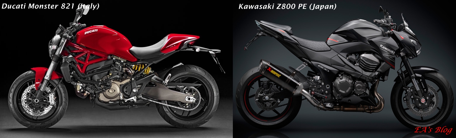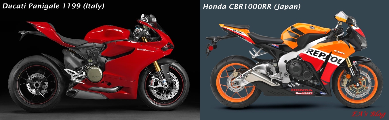 Seperti yang telah sedikit disinggung pada paragraf kedua tadi. . . Urusan desain, Kedua Pabrikan ini memiliki konsep yang berbeda satu sama lain Brosist. . . Jika pada pabrikan jepang menganut Desain yang Sporty, Stylish & Agresif (Yamaha , Kawasaki , Suzuki) serta Elegan & Everlasting (Honda) , Maka Pabrikan Eropa hampir semuanya Kompak untuk menghadirkan Desain yang Keren, Mewah & Sophisticated (Ducati, Aprilia, KTM, BMW, Bimota, Triumph, Benelli dll). . . Coba kita amati contoh kecil pada kedua Produk di bawah ini Brosist 😀