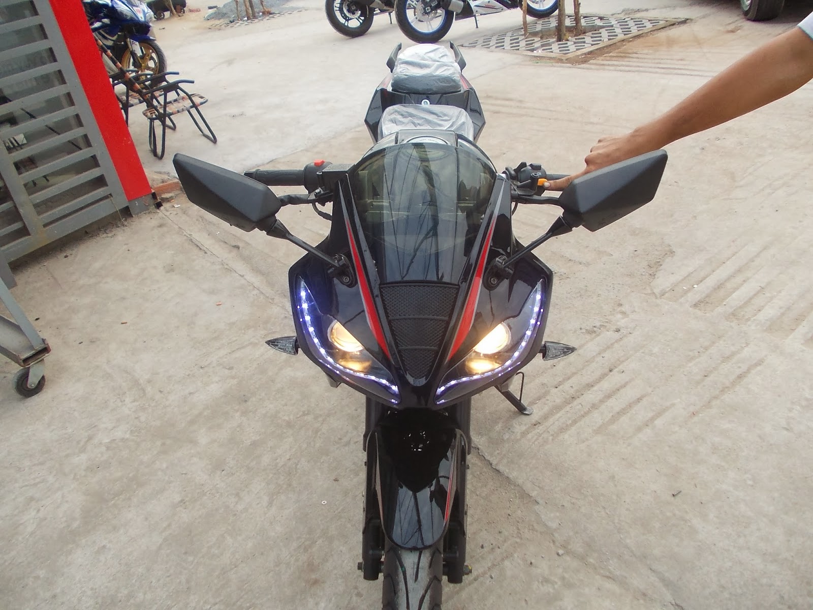 tampak depan niru triumph, bodi minerva, spion ninja 250, sasis cbr150, knalpot cbr1000rr,… “kelas berat” nih