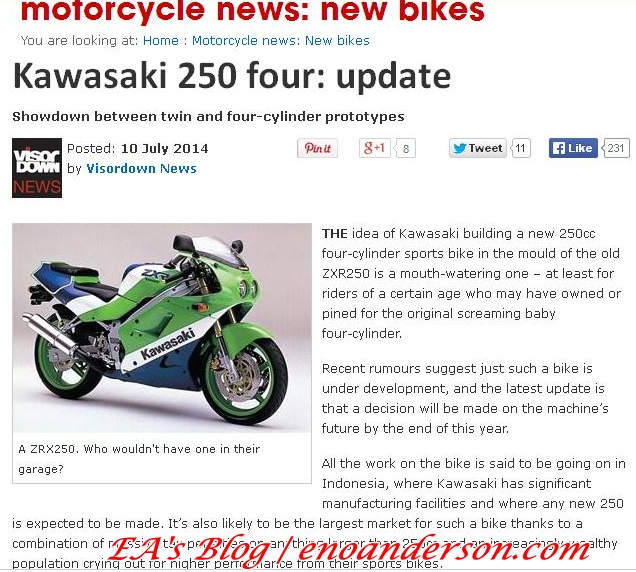 Pernyataan Ninja 250 Baru tersebut juga bukan hanya sekedar isapan jempol. . . Pasalnya, Blogger panutan EA’s Blog juga sudah sempat memuat planning Ninja tersebut, yang ternyata masih bimbang antara 250cc Twin Silinder atau sekalian ke yang heboh yakni 4-Silinder segaris. . . Yang mengejutkan, Media Otomotif ternama sekelas Visordown pun juga telah membuat berita Ninja 250 Anyar tersebut , Sayangnya saat itu beritanya langsung tenggelam dengan euforia nya YZF R25. . .