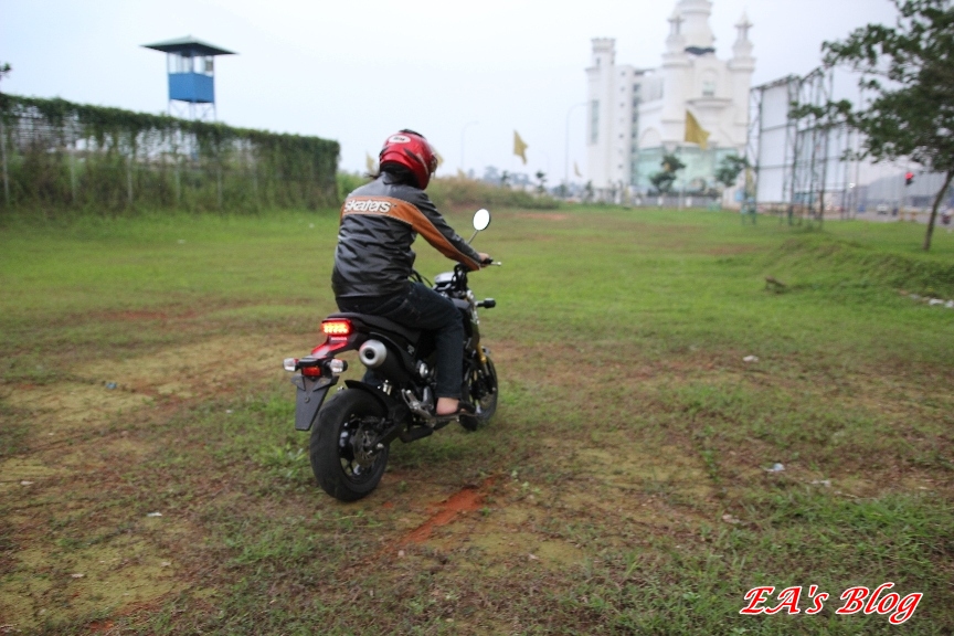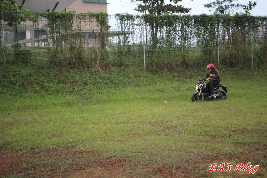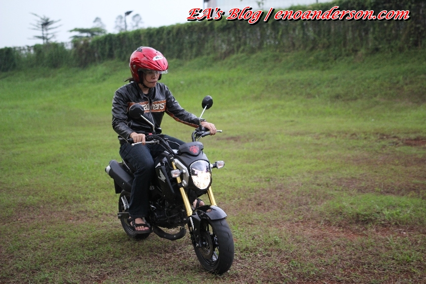Hasilnya di luar dugaan, Meski saat itu Rerumputan sangat licin karena habis diguyur gerimis, Tapi MSX 125 masih mampu dibawa mereng-mereng Brosist. . . Bahkan saking mantapnya cengkraman Ban Gambot berlabel Vee Rubber ini, Kami berdua sangat pede meliuk-liuk diatas Motor ini dalam trek yang licin. . . Yaa ampun, EA langsung ngiler loh Brosist, Sayangnya saat menilik harganya, Aduuhh Biyungg ampuun 😀