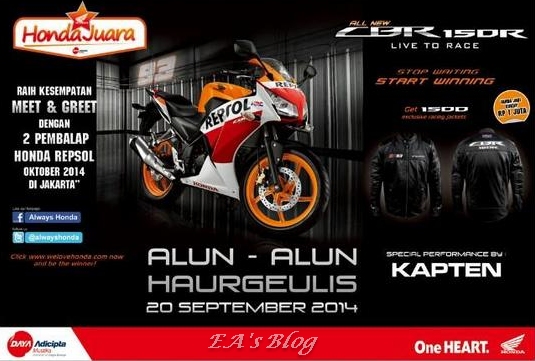 Oiya, Untuk peluncuran All New CBR15oR di Area Karawang pada tanggal 11 Oktober Nanti, Insyaallah EA’s Blog akan hadir kesana untuk kuralang-kuriling 😛 sekaligus meliput acara tersebut (Jika tak ada keperluan mendadak). . . So, Baturan & Duduluran di Karawang, Bersiap nyak lurrr. . . Apalagi yang sudah kepincut berat sama All New CBR150R ini, EA’s Blog sarankan yang penasaran Nanti Langsung ke Lokasi dan langsung Mengelus-elus All New CBR150R nya. . . hehehehee  😀