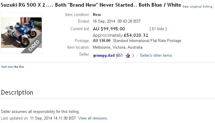 Jika dibandingkan dengan Produk Suzuki keluaran anyar, Sebut saja Flagship sportnya Suzuki GSX-R 1300 Hayabusa yang dijual di Australia seharga 19,250 AUD atau sekitar Rp. 202 Juta-an saja loh Brosist. . . Ini berarti, Suzuki RG500 Gamma yang dijual tersebut hampir 3 kali lipat lebih mahal ketimbang Produk Flagship Suzuki masa kini sekalipun. . . !