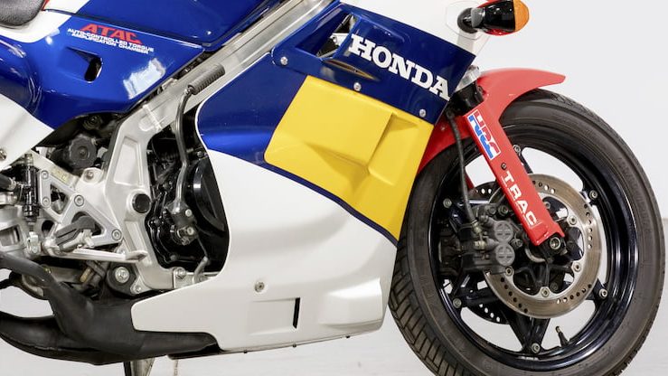 Lanjut ke bagian kaki-kaki depan, suspensinya pakai bikinan Showa dengan fitur anti-dive atau yang disebut Honda sebagai TRAC (Torque Reactive Anti-dive Control). Sebelum ada teknologi shock upside down, suspensi teleskopik anti-dive begini nih yang jadi idola di balap GP500 era 80-an. Sementara di suspensi belakangnya, Honda pakai monoshock dengan konfigurasi pro-link. Lagi, setup suspensi ini juga punya banyak kemiripan sama versi originalnya.