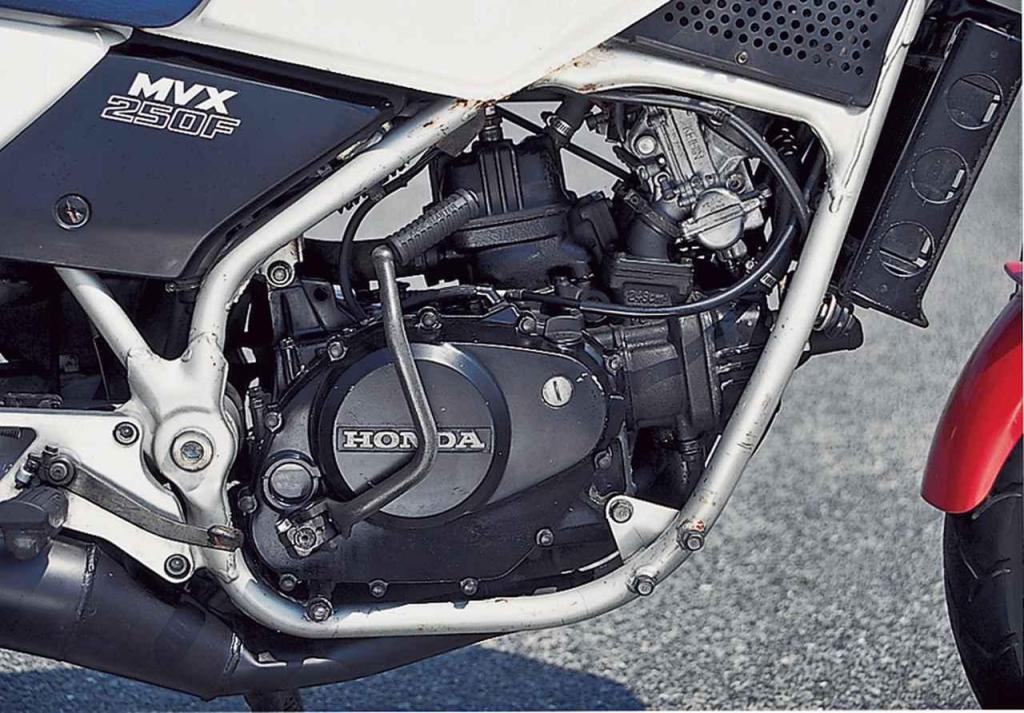 Meskipun sama-sama pakai desain single crankshaft, mesin MVX250F ini pakai 2 silinder di depan plus 1 silinder tambahan yang vertikal dibelakang. Ini tentunya berbanding terbalik dari NS500 yang pakai 1 silinder horizontal alias selonjoran, plus 2 silinder yang vertikal. Kemudian, kalau NS500 itu pakai bank angle 112°, mesin 250cc di MVX250F ini pakai desain bank angle 90°. Dan persis kayak NS500 versi awal yang belum pakai PowerValve, MVX ini juga belum pakai Power Valve. Entah ini kesamaan yang bagus atau justru jelek ya sebenarnya?