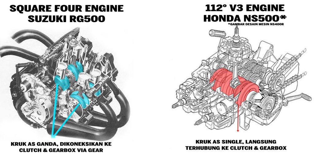 Meskipun kelihatannya lebih simpel dari mesin V4 Yamaha atau Square Four Suzuki, tapi sama sekali nggak ada yang remeh temeh dari mesin racikan Miyakoshi ini. Contoh yang pertama nih, kalau di era tadi motor 2-Tak V4 itu masih pakai dua kruk as terpisah di masing-masing blok, mesin Honda ini pakai single crankshaft atau kruk asnya cuma ada sebiji doang. Selain berfungsi buat nurunin bobot mesin secara signifikan, tipe kruk as begini juga mampu meminimalisir power loss dibanding yang pakai dual crankshaft.