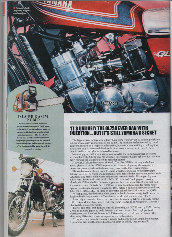 Pertama dari Yamaha GL750, itu lihat deh bagian system penyuplai bahan bakarnya, kayak cuma ditutupin box yang dibikin dari bahan metal. Teori injeksi palsu ini juga didukung lewat rilis Yamaha yang nggak menyebutkan secara detail soal injeksi bahan bakar yang mereka pakai itu tipe apa, gimana cara kerjanya, atau minimal mamerin unit injeksinya lah buat dianalisa sama press waktu itu.