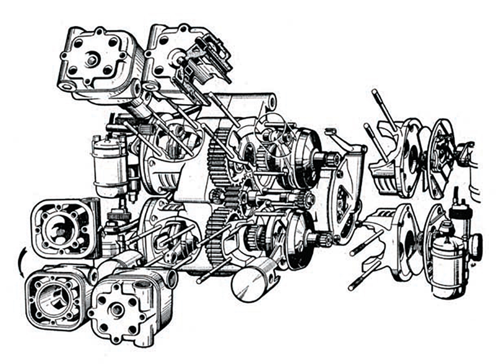 Kalau dilihat dari spek teknis, aslinya sih nggak ada yang aneh di mesin V4 JAWA ini. Bloknya dibikin pakai aluminium alloy, linernya dari baja-nikel, pendinginan juga sudah pakai radiator – meskipun system sirkulasinya masih termosiphon – terus karburatornya juga pakai bikinan AMAL yang masih tipe pre-monobloc. Semuanya terlihat normal