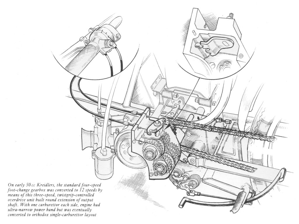 Usut-punya usut, ternyata gearbox 12-speed Kreidler inilah yang bikin pebalap baru di tim Factory Kreidler susah beradaptasi sama karakter motornya. Ini bukan saya yang bilang lho ya, tapi dari ucapannya Luigi Taveri sama Tarquinio Provini. Dan ya, keduanya itu adalah ex Juara Dunia.
