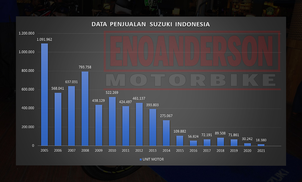 Tapi begitu euforia keduanya berakhir dan nggak ada produk baru lagi dari Suzuki, ditambah kondisi awal pandemi, angkanya drop lagi jadi 30 ribuan unit pertahun. Dan coba tebak berapa angka market share Suzuki di 2021 kemarin? Iyap, angkanya adalah 18.380 unit doang pertahun… Dimana Honda & Yamaha, masing-masing bisa jualan 3,9 juta & 1 juta unit motor ditahun yang sama.