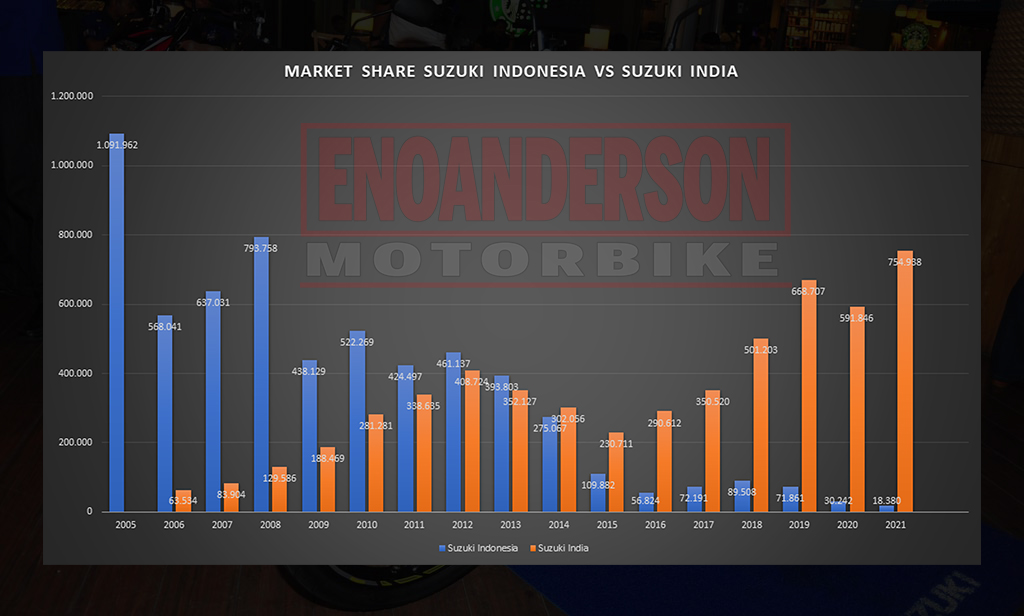 Kalau awal 2000-an dulu Suzuki bisa bersaing secara penjualan bareng Honda & Yamaha di Indonesia, Suzuki India justru cuma bisa gigit jari. Nah di 2022, kondisinya jadi terbalik 180°. Kalau Suzuki di Indonesia kondisinya sangat miris secara penjualan, nah Suzuki India secara fenomenal justru menjadi salah satu pabrikan terbesar di negeri Shahrukh Khan tadi.