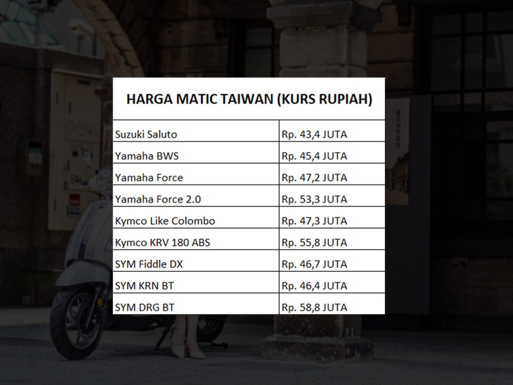 Karena kalau kita bandingin secara kurs, harga matic keren di Taiwan tadi memang bisa 2 kali lipat dibanding disini! Tuh lihat aja di tabel yang saya sertakan diatas.
